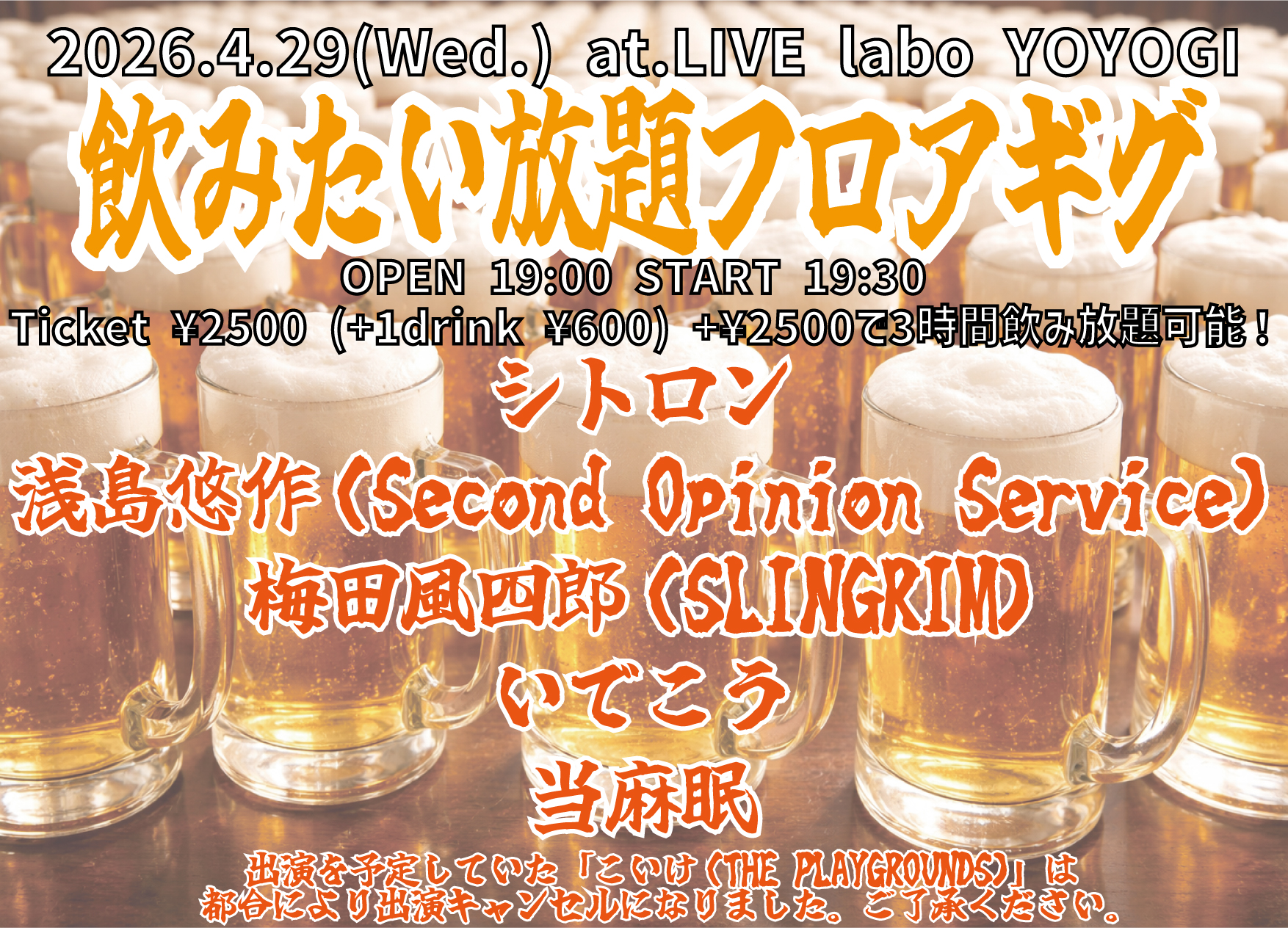 JUSTSIZE JUSTICE/スズキエリ/ショウエイ/ツチハシノブユキ/ほろよい/カトウマサタカ/1869/浅島悠作(Second Opinion Service)/藤原しゅう/あすけ(utsuro-tanuki)/YYG48/関ヶ原秀三郎/古川ケイタ/松浦勇次/ハセガワトシユキ/宗教団体 月のムジカントゥン 代表 壱 良月/momo(ガムシロップ)/ウクレレの人/味可/Jump(camellia)/Joey/アメヲ/タテヨーコ(映像出演)/and more…!!! 似顔絵ブース:ツチヤヒトミ